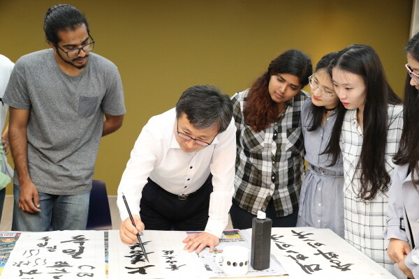 [대학저널 임지연 기자] 부산대학교 전호환 총장이 교내 외국인 교수와 학생들을 초청해 지난 17일 부산대 대학문화원 누마루에서 ‘붓글씨 쓰기 특강’을 가졌다.