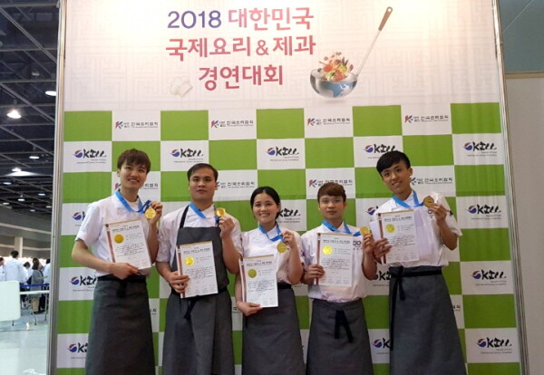 [대학저널 임지연 기자] 동원대학교(총장 이걸우) 호텔조리과 학생들이 지난 19일 서울 양재동 aT센터 제2전시장에서 개최된‘2018 대한민국 국제요리&제과 경연대회’라이브 코스 단품요리 경연에 참가해 참가자 전원 최우수상과 금상을 수상하는 쾌거를 거뒀다.