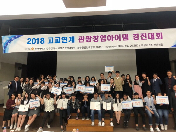 [대학저널 임지연 기자] 동국대학교 경주캠퍼스 상경대학 호텔관광경영학부가 지난 26일 동국대 경주캠퍼스 백상관 컨벤션홀에서 2018 고교연계 관광창업아이템 경진대회를 개최했다.