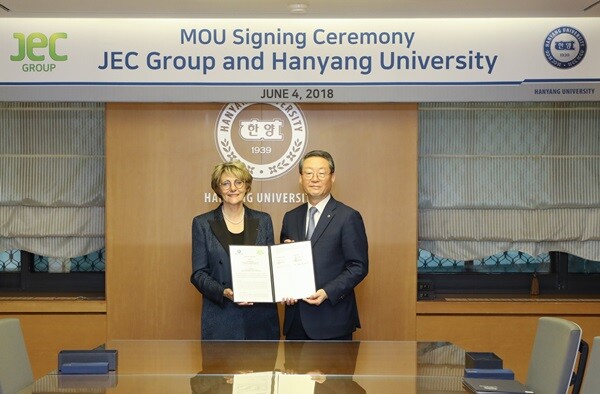 [대학저널 최진 기자] 한양대학교(총장 이영무)는 지난 4일 한양대 서울캠퍼스에서 프랑스 복합소재산업 기업인 JEC그룹(회장 프레데릭 뮈텔(Mutel))과 복합소재 분야의 산학협력을 위한 업무협약을 체결했다.
