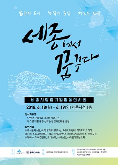 세종시와 홍익대 세종캠퍼스가 공동주최하는 이번 전시회는 세종특별자치시 16개 우수 창업기업들이 참여하는 행사로 창업기업들의 성과를 알리고 기업인지도를 높이고자 기획됐다. 이번 전시회 관람객들은 제품을 체험해보고 선착순으로 샘플을 받을 수 있다.