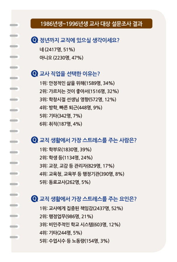 최근 경기도교육청 대변인실 소속 김차명 교사가 1980~1996년생 교사 4656명(남성 829명, 여성 3826명)을 대상으로 진행한 설문조사 결과에 따르면 설문에 답한 교사 47%가 ‘정년까지 교편을 잡을 마음이 없다’고 답했다. 이유는 ‘직장에 대한 회의감’과 ‘교사를 바라보는 사회의 시선’, ‘체력적인 측면’, ‘학생들과 세대 차이’ 등이다.