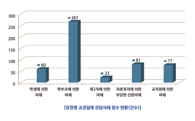 한국교원단체총연합회(이하 교총)가 5월 발표한 ‘2017년 교권회복 및 교직상담 활동실적 보고서’에 따르면 학교현장 교권침해 건수는 10년 전보다 250% 증가했다. 교권침해 종류도 ▲학부모에 의한 피해(267건, 52.56%) ▲처분권자에 의한 부당한 신분피해(81건, 15.81%) ▲교직원에 의한 피해(77건, 15.22%) ▲학생에 의한 피해(60건, 11.81%) ▲제3자에 의한 피해(23건, 4.53%%) 등 다양하다.