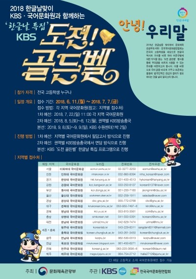 문화체육관광부와 KBS가 공동 주최하는 한글날 특집 ‘KBS 도전 골든벨’은 지역 고등학생들을 대상으로 지역 예선 1, 2차 예선으로 나눠 진행된다. 1차 예선은 오는 7일까지 한남대 국어문화원 홈페이지(urimal.hnu.kr)에서 참가신청서를 내려 받아 작성한 후 이메일로 접수하면 된다. 1차 지역예선에 선발된 학생들은 국어문화원장 상장이 수여되고 예선을 1등으로 통과한 학생에게는 한남대 총장상이 수여될 예정이다.