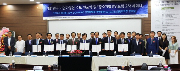 10일 경상대학교(총장 이상경) 경영대학 대강의실에서 ‘기업가정신 수도 선포식 및 중소기업경영포럼 세미나’가 개최됐다. 이 행사는 한국경영학회(회장 이두희 고려대 교수)와 진주시, 경남지방중소벤처기업청, 매일경제신문이 주최하고 경상대 경영대학·경영경제연구소·LINC+사업단과 (사)한국글로벌기업가정신연구원이 주관해 진행됐다.