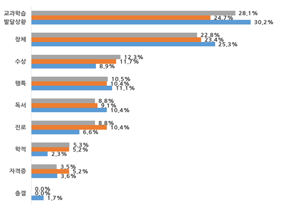 서울 11개, 15개의 일부 대학과 비교하면 교과학습발달상황을 가장 많이 평가하지만 비중은 약간 감소하고, 수상항목의 비중이 증가했다. 창의적 체험활동 역시 두 번째로 많이 평가하는 항목이지만 선호하는 대학으로 학교 수를 좁혀 갈수록 비중이 감소했다. 그 외에도 독서활동이나 진로희망사항 역시 선호 대학별에 따라 비중이 달라지는 경향을 보였다.