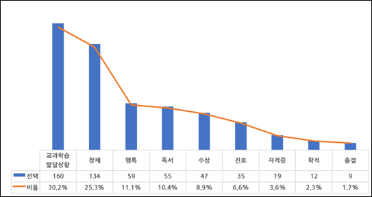 대학에서 선택한 학교생활기록부 평가 항목을 살펴보면, 학생부종합전형에서도 교과 관련 항목인 ‘교과학습발달상황’의 비중이 높았다. 대부분의 학생부종합전형을 실시하는 대학에서는 교과 성적을 정량적으로만 평가하는 것이 아니라 정성적으로 ‘종합평가’하기 때문에 교과 성적을 기준으로 대학의 지원여부를 결정할 수는 없다. 하지만 학생의 다양한 측면을 평가한다는 학생부종합전형에서 학업역량을 나타내는 대표적인 항목인 교과학습발달상황 중심으로 서류 평가를 실시한다는 점도 눈여겨볼 필요가 있다.