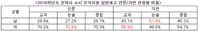 이외에도 인문계열 여학생의 논술전형 지원 비율이 타 전형보다 높은 것으로 나타났다. 진학사 측은 인문계열 남학생은 타 전형에 비해 논술전형을 선호하지 않는 것으로 보인다고 분석했다. 반면 자연계열은 남학생의 논술전형 지원이 51.5%로 선호가 높은 편이며, 여학생은 교과전형과 종합전형을 선호하는 것으로 나타났다.