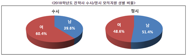 진학사 모의지원 데이터에 따르면, 전년도 진학사 수시 모의지원자 중 60.4%가 여학생, 39.6%가 남학생인 것으로 나타났다. 반대로 정시에서는 남학생 51.4%, 여학생 48.6%로 근소한 차이지만 남학생의 지원 비율이 높았다.