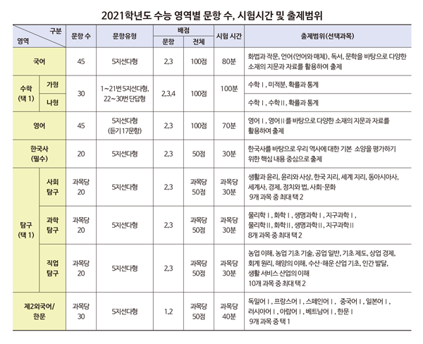 2021학년도 수능은 현 고1 학생들이 2020년에 응시할 시험이다. 출제범위는 지난 2월 28일 사전 발표했으며, 시험체제는 현행 수능과 동일하다(출제범위는 하단 표 참조).