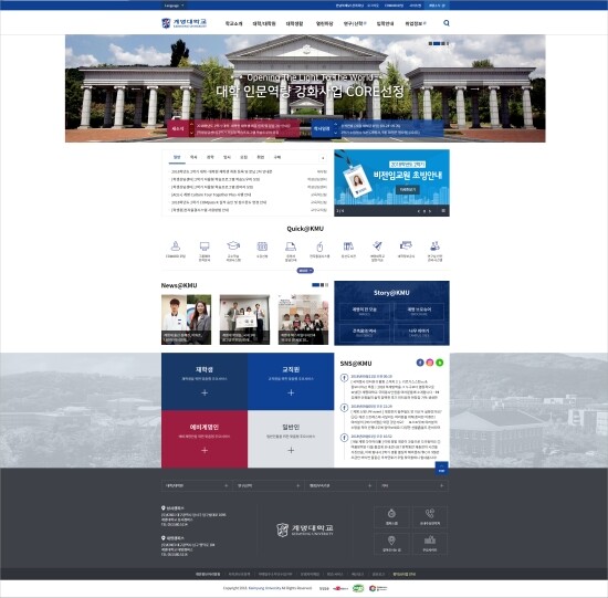 이번 ‘굿콘텐츠서비스인증’을 받은 계명대 홈페이지는 지난 6월 대대적 개편을 통해 사용자 편의성에 맞도록 디자인해 새롭게 열렸다. 학사안내, 학생지원, 학생활동 등 전반적 정보를 쉽게 찾을 수 있도록 메뉴를 재구성했으며 학생들이 가장 많이 사용하는 공지사항이나 학사일정 등을 메인화면 상단에 배치하고 퀵메뉴를 중앙에 배치해 기능적 면에도 신경을 썼다.