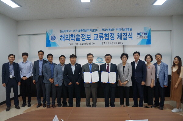 이날 협약 체결식에는 경상대 장봉규 도서관장을 비롯해 도서관 외국학술지지원센터 관계자와 조영혁 한국남동발전 인재기술개발원장을 비롯해 한국남동발전 인재기술개발원 관계자 등 20여 명이 참석했다.