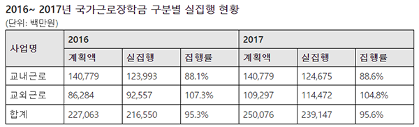 자료에 따르면, 2016년 교외근로 장학금의 계획액은 당초 862억 8400만 원이었으나 실집행은 이를 훨씬 초과한 925억 5700만 원으로 집행률은 107.3%였다. 2017년의 경우 교외근로 계획액이 1092억 9700만 원이었지만 실집행액은 1144억 7200만 원으로 104.8%의 집행률을 기록했다.