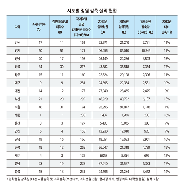 국회 교육위 이찬열 의원(바른미래당, 국회 교육위원장)이 교육부로부터 제출받은 대학 구조조정 시행 이전인 2013년 대비 2018년 입학정원을 비교, 분석한 결과 전북은 입학정원이 무려 18%가 감소해 전국 17개 지역 중 정원 감축 폭이 가장 컸다. 이어 경북, 충남 17%, 전남, 세종의 경우 각각 16% 입학정원이 감축됐다. 이는 같은 시기 서울의 경우 단 1%가 감축된 것과 비교하면 격차가 매우 큰 것이다.