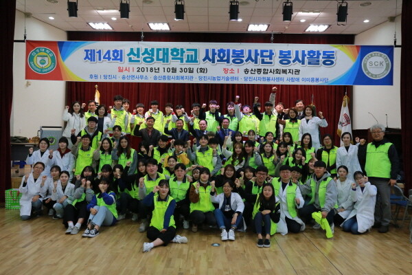 2000년부터 시작한 신성대 사회봉사단은 2003년 마산에서 태풍 피해복구 봉사활동, 2007년 태안 기름유출 방제 봉사활동에도 참여해 왔었다. 학생들은 해마다 지역주민들을 위해 대학에서 배운 전공관련 기술을 재능기부 방식으로 봉사를 펼쳐오고 있다.