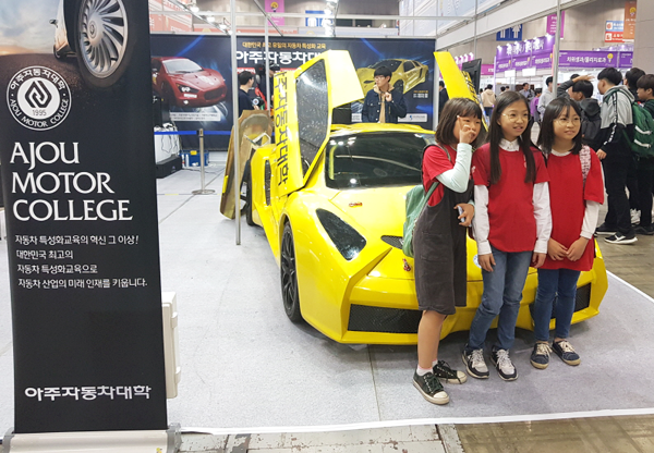 아주자동차대는 ‘자동차 전문가의 꿈’을 주제로 드라이빙 시뮬레이터 체험과 재학생들이 만든 수제 슈퍼카 2호 체험 부스를 마련해 운영했다.