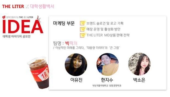 9월부터 진행된 공모전에서 빅피쳐 팀은 ‘더 좋은 생각, THE LITTER 아이디어 제안’을 주제로 하는 마케팅 부분에서 브랜드 슬로건 및 로고 기획, 매장운영 및 활성화방안, THE LITTER MD 상품 판매전략을 제안했으며 더 리터의 대용량 이미지에 친근함을 더한 컨셉 제안으로 좋은 평가를 받았다. 빅피쳐팀은 상장과 상금 100만 원을 수상하고 수상작은 TV 및 잡지광고에 게시될 예정이다.