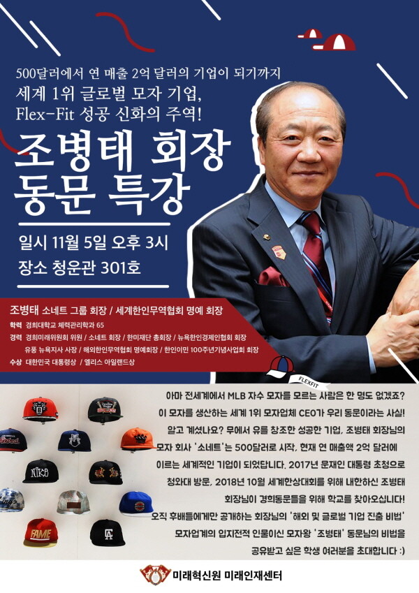 [대학저널 임지연 기자] 경희대학교(총장 조인원) 미래혁신원이 5일 오후 3시 경희대 서울캠퍼스 청운관 301호에서 조병태 소네트 회장(체력관리학과 65학번, 現 체육대학)의 ‘동문 특강’을 개최한다. 이번 특강의 주제는 ‘해외 및 글로벌 기업 진출 비법’으로, 해외 진출을 원하는 학생들에게 자신의 성공 이야기를 들려줄 예정이다.