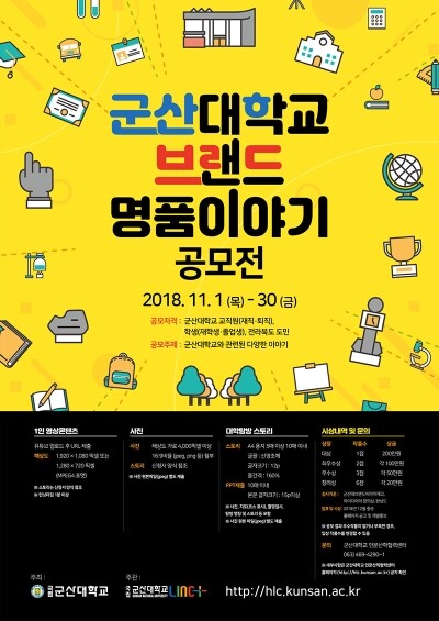 [대학저널 오혜민 기자] 군산대학교(총장 곽병선)는 대학 인지도 제고 및 홍보 콘텐츠 발굴을 위해 ‘군산대 브랜드 명품이야기’ 공모전을 연다.