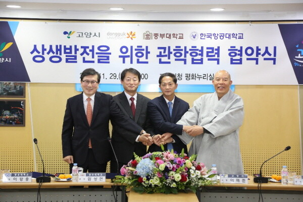 [대학저널 임지연 기자] 동국대학교(총장 한태식)는 29일 고양시청에서 고양시(시장 이재준)와 중부대(총장 엄상현), 한국항공대(총장 이강웅) 등 지역대학들과 상호 발전과 지역사회의 기여를 위한 협약을 체결했다. 각 기관들은 지역 활성화와 청년 일자리 창출 등 공공 이익 기여 등에 긴밀히 협력할 방침이다.