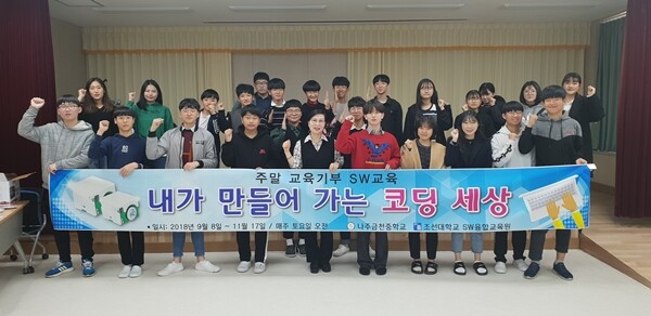 [대학저널 유재희 기자] 조선대학교(총장 강동완) SW융합교육원(원장 정일용)은 에너지 ICT 공기업인 한전KDN, 전라남도교육청과 공동으로 진행하는 ‘2018학년도 주말 교육기부 SW교육봉사’를 성황리에 마쳤다.