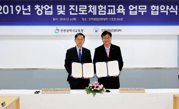 [대학저널 신영경 기자] 인하공업전문대학(총장 진인주, 이하 인하공전)는 6일 인하공전 11호관 5층 첨단강의실에서 인천광역시교육청과 '창업 및 진로체험교육 업무 협약'을 체결했다.