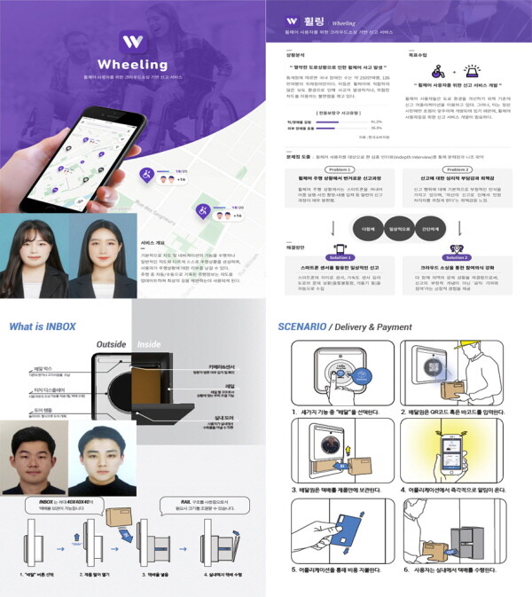 국무총리상을 받은 이다영·이은솔 씨의 출품작 ‘Wheeling’은 휠체어 사용자를 위한 공공신고기반 내비게이션이다. 교통취약자인 휠체어 사용자를 위해 최적의 경로를 추천해주고 스마트폰 센서로 주행 중 발생한 문제 상황에 대한 기록이 가능하다.