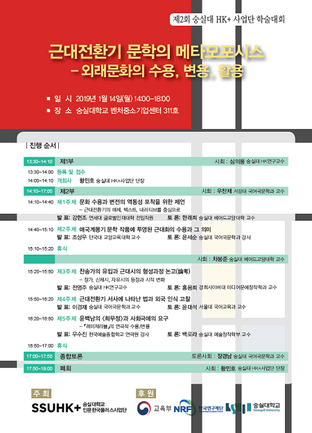 [대학저널 임지연 기자] 숭실대학교(총장 황준성) 한국기독교문화연구원 HK+사업단(단장 황민호)이 오는 14일 오후 2시부터 6시까지 숭실대 벤처중소기업센터 311호에서 ‘근대전환기 문학의 메타모포시스-외래문명의 수용, 변용, 활용’을 주제로 제2회 학술대회를 개최한다.