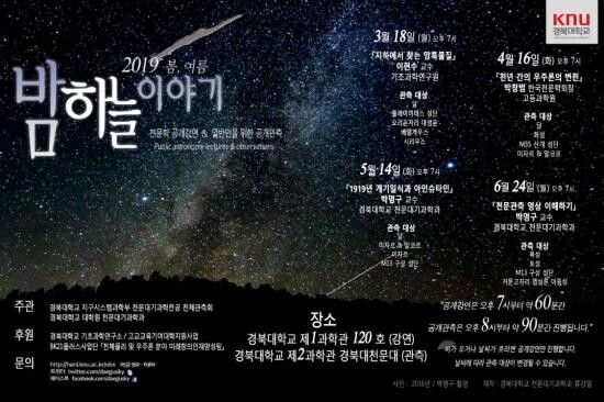 경북대 지구시스템과학부 천문대기과학전공은 ‘2019 봄, 여름 밤하늘 이야기’를 오는 18일과 4월 16일, 5월 14일, 6월 24일 경북대 제1, 2과학관에서 연다.