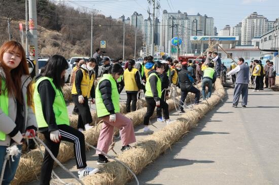 이날 봉사활동에는 재학생 및 교직원으로 구성된 신성대 사회봉사단원들이 지역을 대표하는 행사의 성공적 개최를 기원하는 마음으로 봉사활동에 임했으며 큰 줄이 완성될 때까지 현장에서 주도적 활약을 펼쳤다.