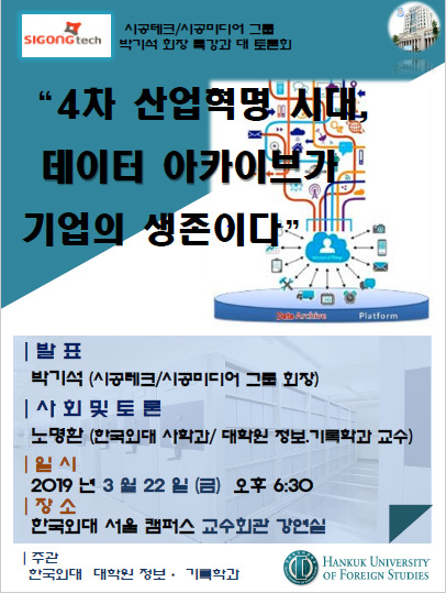 [대학저널 임지연 기자] 한국외국어대학교(총장 김인철) 대학원 정보·기록학과는 오는 22일 한국외대 서울캠퍼스 교수회관 강연실에서 박기석 시공데크·시공미디어 그룹 회장을 초청해 “4차 산업혁명 시대, 데이터 아카이브가 기업의 생존이다”를 주제로 특강을 개최하고, 아카이브 및 각 관련 분야의 전문가들과 함께 대 토론회를 진행한다.