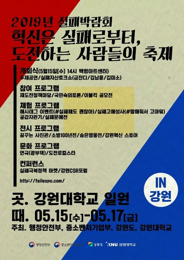 강원대학교(총장 김헌영)는 5월 15일(수)부터 17일(금)까지 강원대 춘천캠퍼스 백령아트센터, 60주년기념관, 함인섭광장 일원에서 「2019 실패박람회 in 강원」을 개최한다.