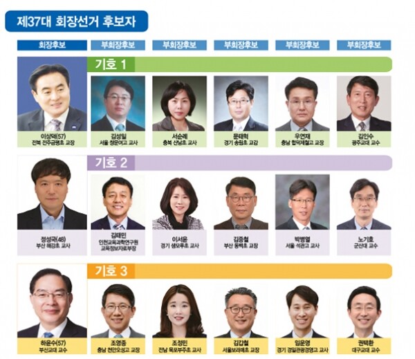 회장 후보는 기호 1번 이상덕(전북 전주금평초 교장), 기호 2번 정성국(부산 해강초 교사), 기호 3번 하윤수(부산교대 교수) 등 3명이다. 후보들은 5월 7일부터 6월 6일까지 열띤 선거운동을 펼친 바 있다.