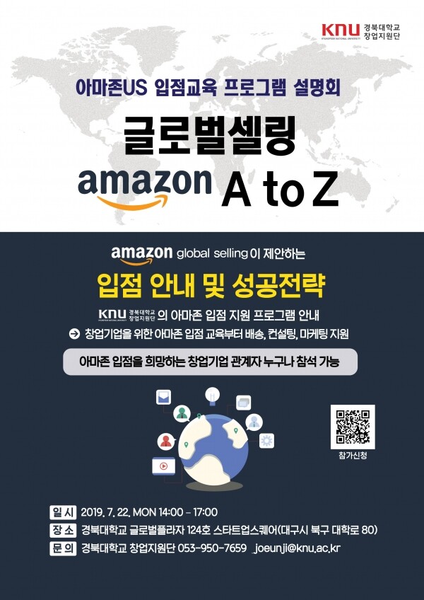 [대학저널 임지연 기자] 경북대학교(총장 김상동) 창업지원단(단장 임기병)은 초기 창업기업의 글로벌 시장 발굴과 안정적 판로 개척을 위해 미국 온라인쇼핑몰인 ‘아마존’ 입점 설명회를 오는 22일 경북대 글로벌플라자에서 개최한다.