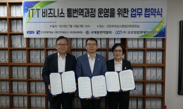 [대학저널 신영경 기자] 조선대학교 시민르네상스 평생교육원(원장 최효상)은 지난 18일 시민르네상스 평생교육원장실에서 국제통번역협회, ㈜코코넷잡앤에이치알디와 'ITT(Interpretation & Translation Test) 비즈니스 통번역과정' 운영에 관한 업무협약을 체결했다.