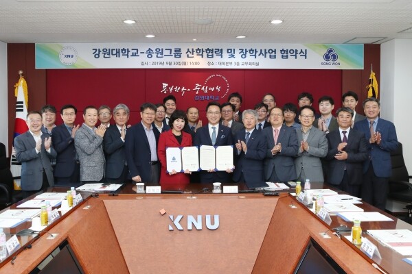 [대학저널 이승환 기자] 강원대학교(총장 김헌영)는 30일 대학본부에서 화학·기초소재 제조업분야 중견기업인 송원그룹(회장 김해련)과 '산학협력 및 장학사업 협약식'을 개최했다.
