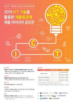 ‘상품화가 가능한 ICT 기술이 활용된 다양한 재활용공예 제품 아이디어’ 주제로 진행되는 이번 공모전은 중소벤처기업부의 ‘2019년 시군구 지역연고산업 육성지원사업(비R&D)’ 일환으로 진행된다.