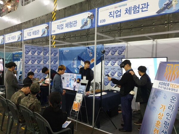 [대학저널 이승환 기자] 코리아텍(한국기술교육대, 총장 이성기) 온라인평생교육원(원장 임경화)은 12일 경남 진해에 있는 독도함 함상에서 해군본부, 창원시, 중소벤처기업진흥공단이 공동 주최한 ‘함상 취업박람회’ 행사에 참가해 해군 장병 등을 대상으로 가상훈련(VT. Virtual Training) 콘텐츠와 스마트 직업훈련 플랫폼(STEP)을 선보였다.