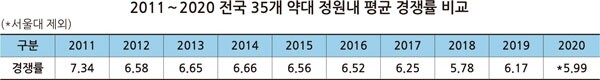 대학별로는 36개교 중 가천대(5.50대 1), 가톨릭대(5.13대 1), 계명대(6.37대 1), 동국대(4.83대 1, 연세대(5.20대 1), 영남대(4.57대 1), 우석대(6.85대 1), 원광대(8.90대 1), 인제대(9.87대 1), 충남대(4.12대 1) 등 10개교가 전년 대비 경쟁률이 상승한 반면에