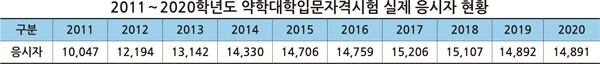 올해 약대 모집정원(1,753명)이 전북대(30명) 및 제주대(30명) 신설로 전년(1,693명) 대비 60명 증가한 반면에 2020 PEET 실제 응시자(1만 4,891명)는 전년도(1만 4,892명)와 비슷해 최종 평균 경쟁률은 전년 대비 소폭 하락한 결과이다.