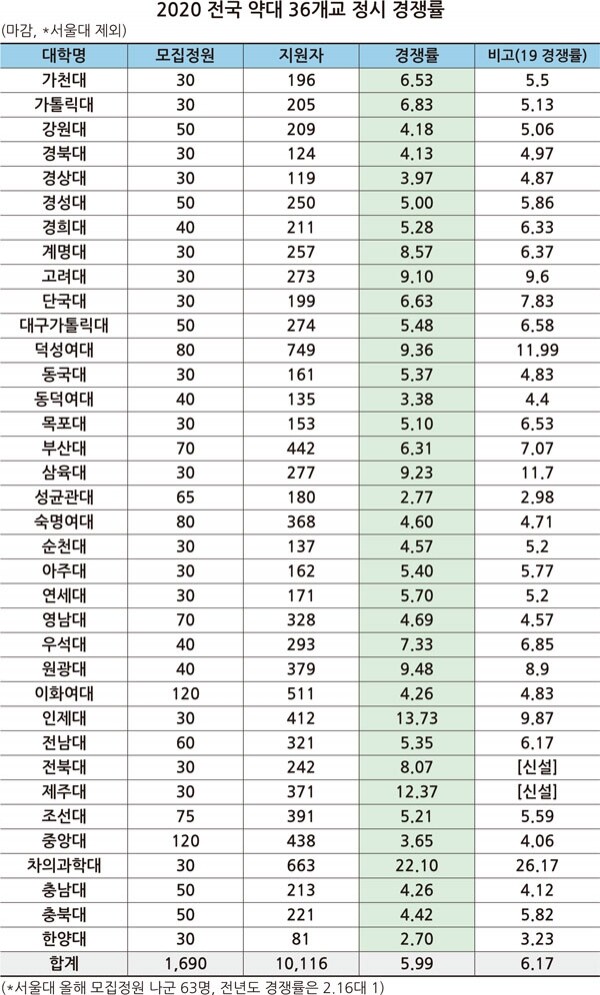 [대학저널 백두산 기자] 2020학년도 전국 37개 약학대학의 정시 원서접수가 11월 13일부터 11월 15일까지 마감한 결과, 가천대, 가톨릭대, 경희대, 고려대, 동덕여대, 숙명여대, 연세대, 이화여대, 중앙대, 한양대 등 36개 대학(경쟁률 비공개 서울대 제외, 전년 대비 전북대 및 제주대 신설 포함)의 정원내 지원 현황은 평균 5.99대 1로 전년도 35개교 6.17대 1보다 소폭 하락한 것으로 나타났다.