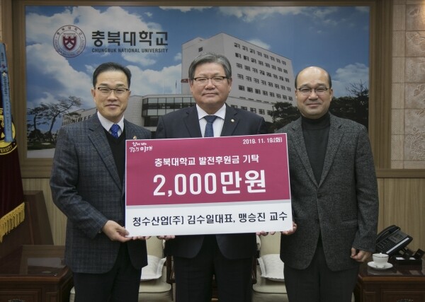 [대학저널 이승환 기자] 충북대학교(총장 김수갑)는 19일 대학본부 5층 회의실에서 김수일 청수산업(주) 대표와 맹승진 지역건설공학과 교수가 후배들을 위한 장학기금으로 각 1천만 원씩 총 2천만 원을 기탁했다고 전했다.