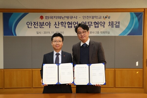 [대학저널 이승환 기자] 인천대학교 산학협력단(단장 옥우석)은 20일 한국지역난방공사 분당본사에서 한국지역난방공사(사장 황장화)와 사업장 안전수준 제고와 미래 안전전문가 양성을 위한 업무협약(MOU)을 체결했다.