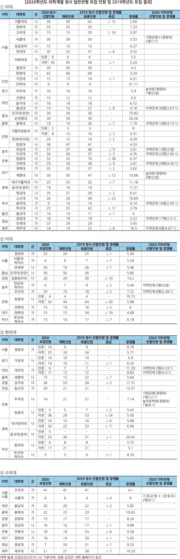 2020학년도 수시모집 결과 의대보다 다소 접근이 용이한 치대와 한의대의 경쟁률 상승이 두드러져 정시에서도 의학계열의 치열한 경쟁이 예상된다.