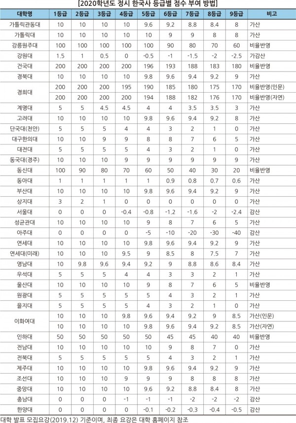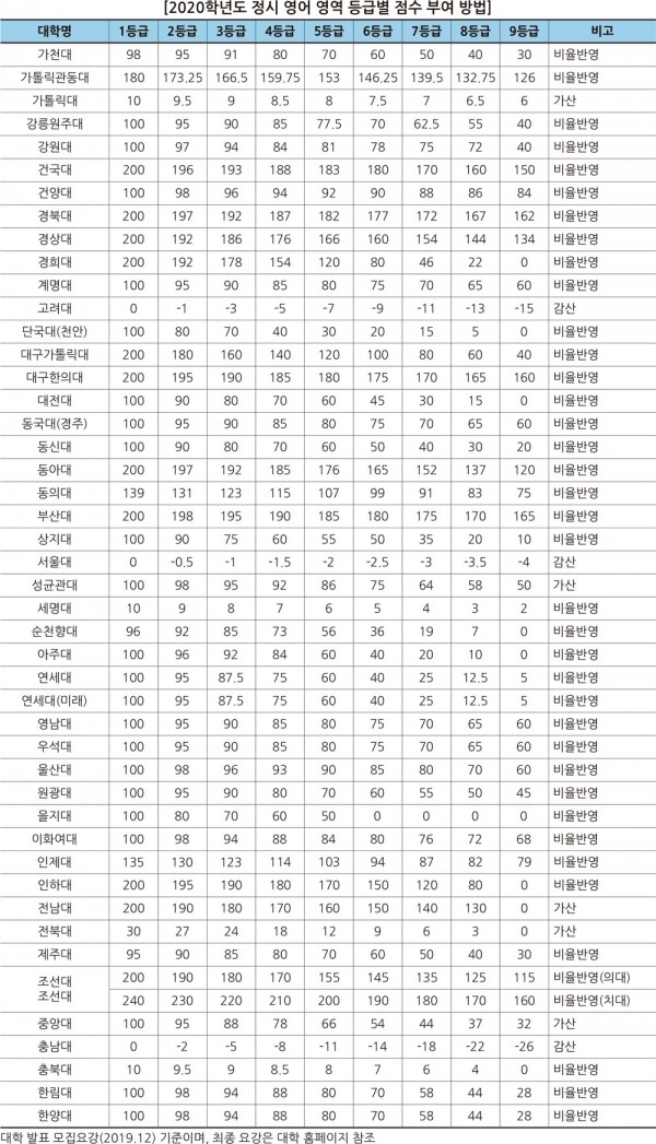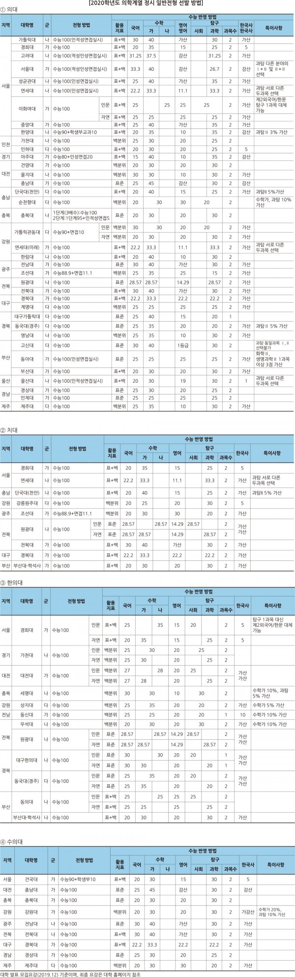 영어 영역 절대평가로 변별력이 줄면서 지난해에 이어 영어 영역 비율을 축소한 대학이 있다. 상지대 한의대는 영어와 탐구 반영 비율을 5%씩 줄이고 수학 반영 비율을 10% 늘렸으며 동신대 한의대는 영어와 탐구 비율을 5%씩 줄이고 한국사를 10% 반영한다. 반면 건양대 의대는 국어와 수학을 5%씩 줄이고 영어 반영 비율을 10% 늘리는 등 반영 비율에 변화가 있다.