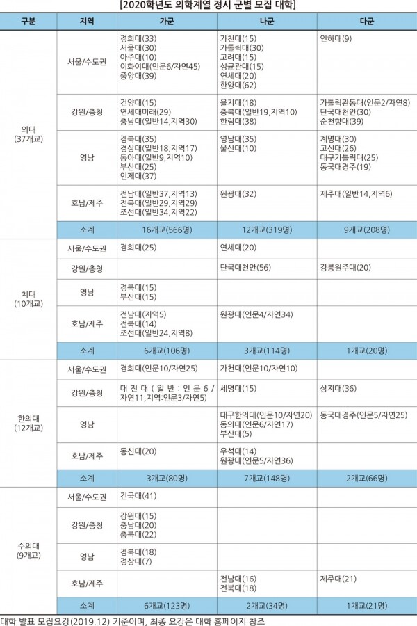 [대학저널 백두산 기자] 2020학년도 정시모집에서 의학계열은 정원내 기준(수시 이월 미포함)으로 의대 1,093명, 치대 240명, 한의대 294명, 수의대 178명을 선발한다. 지난해까지 의학전문대학원이 학부 체제로 전환하면서 의대 모집정원이 크게 증가했으나 올해는 변동 없이 지난해와 비슷한 수준으로 선발한다. 정시 선발 인원은 지난해와 비교해 의대와 치대는 별 차이가 없으며 한의대 중에는 상지대와 우석대가, 수의대 중에는 경상대가 수시 선발 비율이 늘면서 한의대는 28명, 수의대는 17명이 줄었다. 올해 가톨릭관동대 의대가 모집 군을 가군에서 다군으로 변경하면서 상대적으로 지원할 만한 대학이 적은 다군에서 학생의 선택폭이 넓어졌다. 수도권 의대는 가/나군에 몰려있는 반면 지방 의대는 가/나/다군에서 고르게 선발한다. 치대는 가군, 한의대는 나군에 몰려있는 편이며, 수의대는 거의 모든 대학이 가군에서 선발한다.