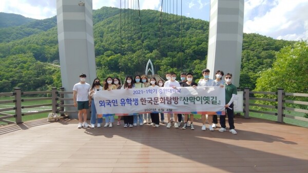 중원대에 따르면 탐방은 20여명 유학생들이 지역 명소인 산막이옛길을 탐방하며 힘든 유학생활로 지친 심신을 위로하고 지역의 역사와 문화에 대해 알아보고자 기획됐다.