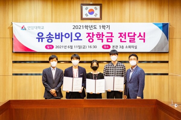 연암대는 지난 11일 후배 영농인재 양성을 위한 ‘유송바이오 장학금’ 전달식을 갖고, 축산계열 3명의 학생에게 장학금을 전달했다고 14일 밝혔다.