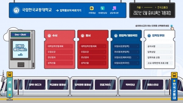 홍창우 한국교통대 입학홍보처장은 “맞춤형 비대면 상담과 카카오톡 상담, 입학 홈페이지 게시판 상담, 대학 입학 전형 안내 동영상 제작 등 대입전형의 공정성과 투명성 강화를 위해 지속적으로 노력하겠다”고 말했다.