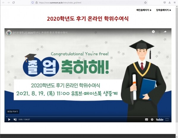 선문대는 신종코로나바이러스 감염증(코로나19) 확산 방지를 위해 졸업식 행사를 취소하고 졸업식 영상을 사전 제작해 온라인으로 진행했다.